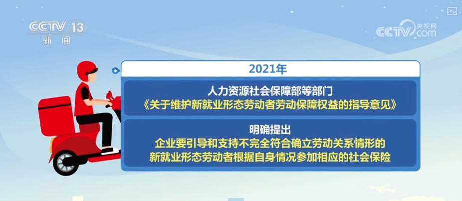 2021年,人力资源社会保障部等部门《关于维护新就业形态劳动者劳动保障权益的指导意见》,明确提出,企业要引导和支持不完全符合确立劳动关系情形的新就业形态劳动者根据自身情况参加相应的社会保险。