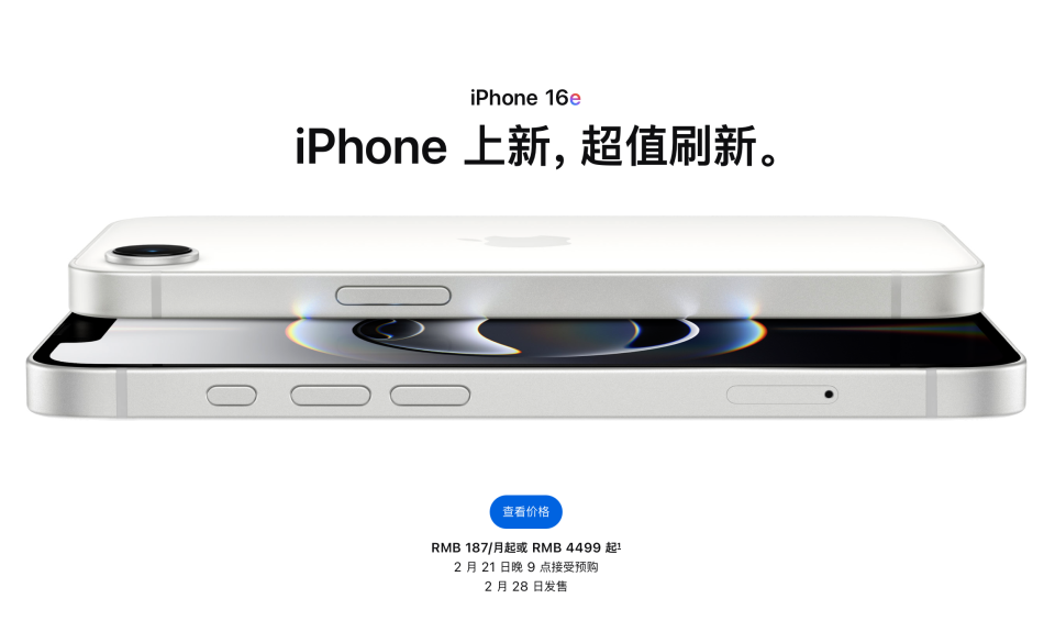近日,苹果发布iPhone 16家族新成员——iPhone 16e,国行版售价4499元起,将于2月21日晚9点起接受预购,2月28日起正式发售。