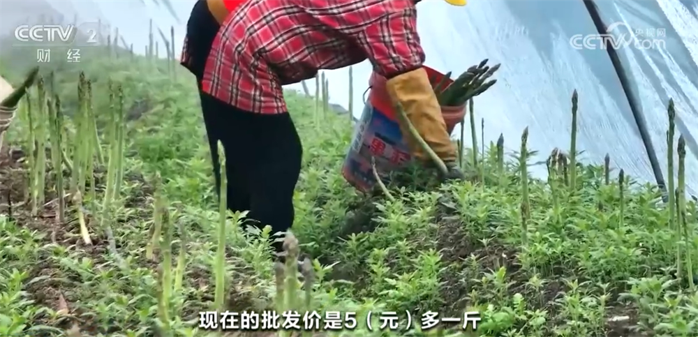 江苏省泰州市白米镇大安村村委会工作人员徐浩称:“我们在大棚里面装了一个二棚。二棚的作用就是保温,提高芦笋的生长速度。现在的批发价是五元多一斤,比正常上市那会儿(三月份)高了一元多。”