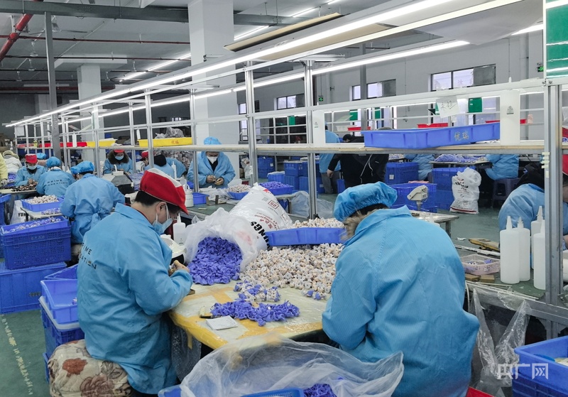 车间工人用棉棒粘上胶水完成人物组装(央广网记者黄珂岚摄)