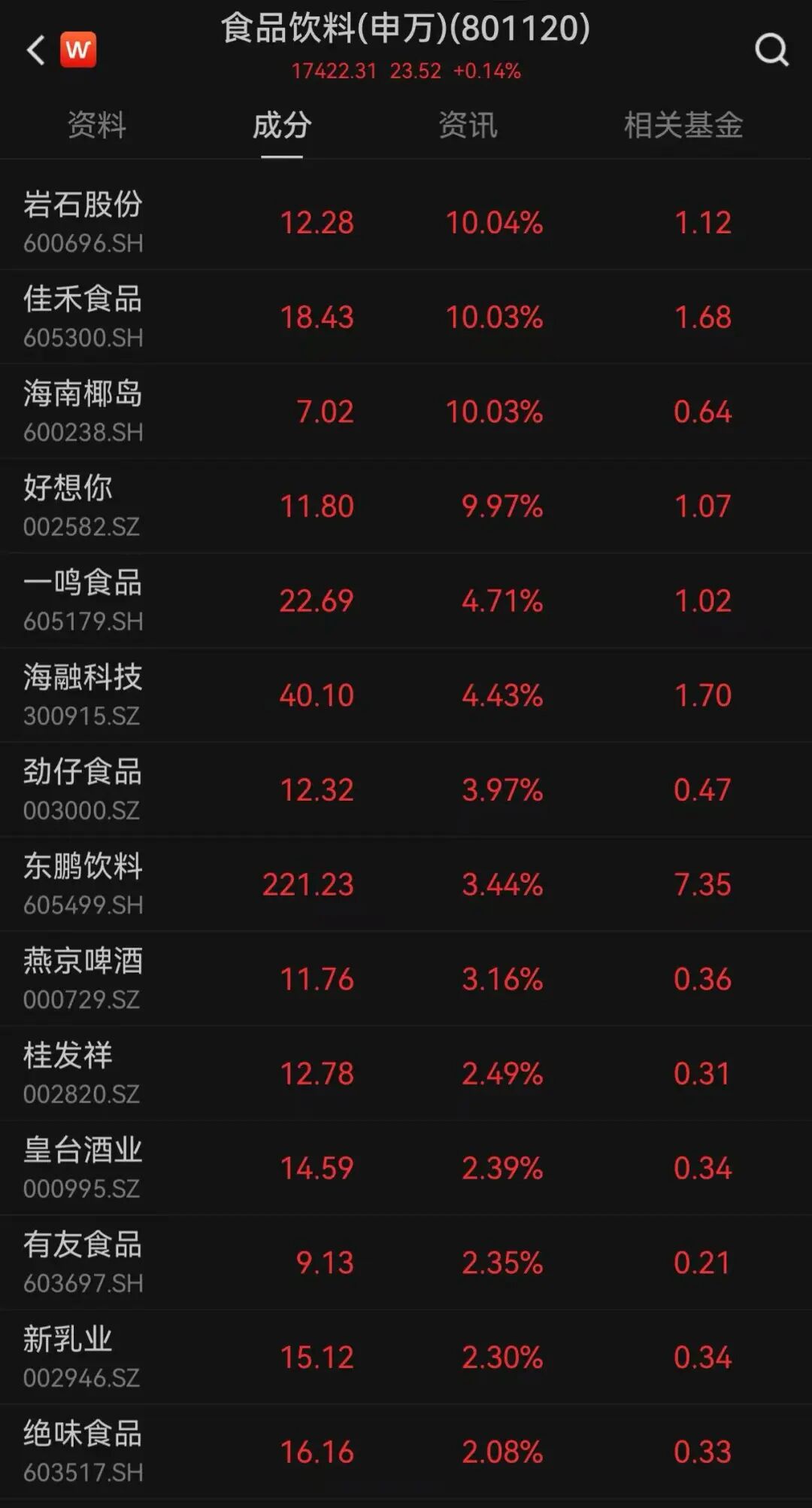 大消费板块今日早盘再度表现强劲,白酒、饮料、食品等细分领域均有不俗表现。截至收盘,岩石股份、海南椰岛、佳禾食品、好想你涨停,一鸣食品、海融科技、劲仔食品、东鹏饮料、燕京啤酒、有友食品、绝味食品等涨幅居前。