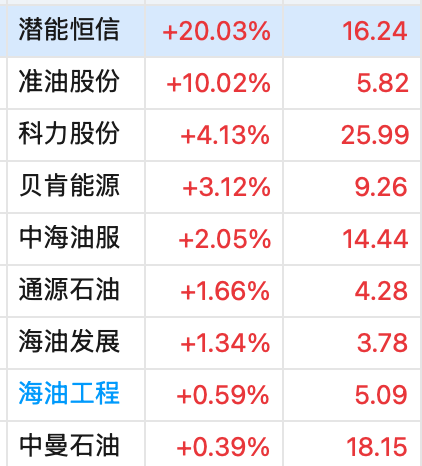 油服工程板块开盘后持续上涨,截至收盘,潜能恒信、准油股份涨停,科力股份、贝肯能源、中海油服涨幅超2%,通源石油、海油发展、海油工程、中曼石油跟涨。