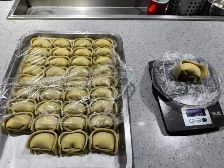 馅料拌好,阿姨们开始包馄饨。馄饨皮是俗称的“黑皮”,里面有荞麦成分,这样嚼起来才有韧性。因为馄饨太大,比号称“上海最大”、52克一只的菜肉馄饨还要重十多克,包起来很需要费点手劲。