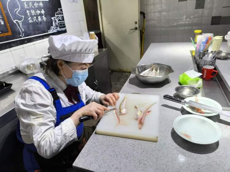 上午10点半,记者走进,后厨师傅正在将新到的刀鱼交给阿姨餐厅店长郑红梅。