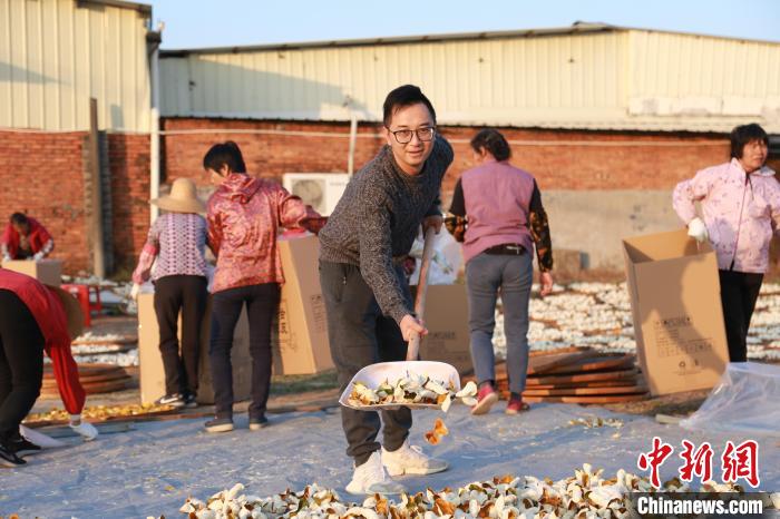 2022年12月,梁伟钊与工人们一起打理晒干的新会陈皮。(受访者供图)