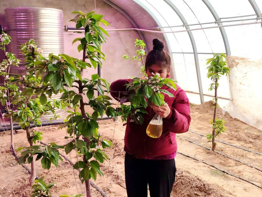工作人员为樱桃花授粉(布热比·艾买尔摄)