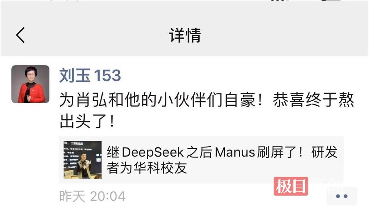 “为肖弘和他的小伙伴们自豪!恭喜终于熬出头了。”3月6日,原华中科技大学启明学院副院长刘玉在朋友圈转发国产AI智能体Manus刷屏的新闻时感慨。在采访时,刘玉用了两个词概括了对肖弘的印象:“低调”“长期主义”,她说:“AI时代,任何前瞻性的技术都离不开对长期主义的坚守和践行,肖弘和他的团队为学弟学妹们树立了榜样。”