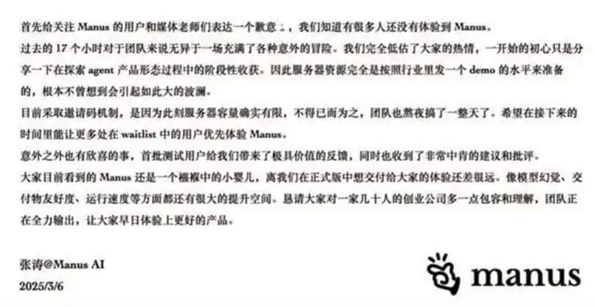 公告还提到,首批测试用户给团队带来了极具价值的反馈,同时也收到了非常中肯的建议和批评。大家目前看到的Manus还是一个襁褓中的小婴儿,离我们在正式版中想交付给大家的体验还差很远。像模型幻觉、交付物友好度、运行速度等方面都还有很大的提升空间。恳请大家对一家几十人的创业公司多一点包容和理解,团队正在全力输出,让大家早日体验上更好的产品。