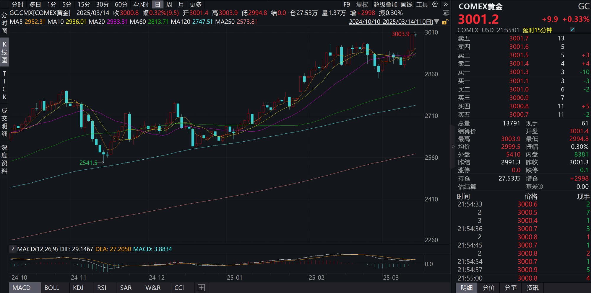 央广网北京3月14日消息(记者冯方)当地时间3月13日,COMEX黄金期价一度站上3000美元/盎司,国际黄金期货价格创下历史新高。现货黄金价格也刷新历史纪录,一度涨至2990.23美元/盎司。截至发稿,国际黄金期价报3001.2美元/盎司,现货黄金价格报2987.5美元/盎司。