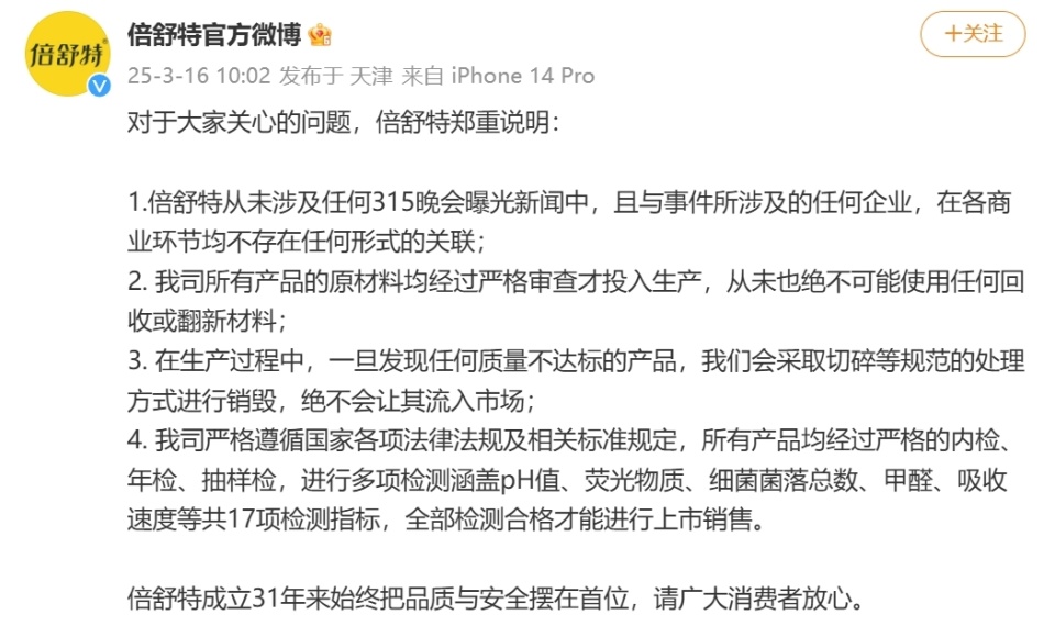 1.倍舒特从未涉及任何315晚会曝光新闻中,且与事件所涉及的任何企业,在各商业环节均不存在任何形式的关联;