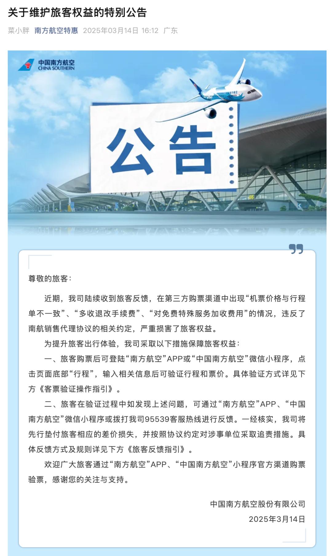 3月14日,南航发布《关于维护旅客权益的特别公告》称,其陆续收到旅客反馈,在第三方购票渠道中出现“机票价格与行程单不一致”、“多收退改手续费”、“对免费特殊服务加收费用”的情况,违反了南航销售代理协议的相关约定,严重损害了旅客权益。