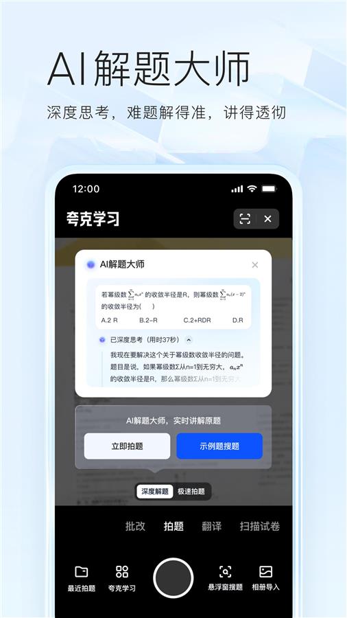 目前,用户可更新至夸克App最新版本,从夸克首页“解题大师”直接免费使用。也可以通过首页相机入口选择“拍题-深度解题”功能,就能让“AI解题大师”进行深度思考,为你讲透每一道难题。其中,极速拍题与深度解题两个入口,分别满足用户对解题效率和解题完整性的不同需求。同时,凭借夸克在百亿级题库和AI扫描技术上的深厚积累,无论是手写体公式还是各类复杂难题,都能实现秒级识别和精准解析,极大提升了用户的学习效率。