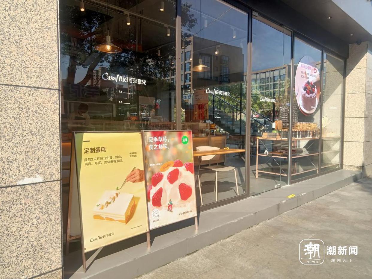 西湖区三墩镇厚仁路商业特色街可莎蜜儿面包店门口立着两块广告牌。