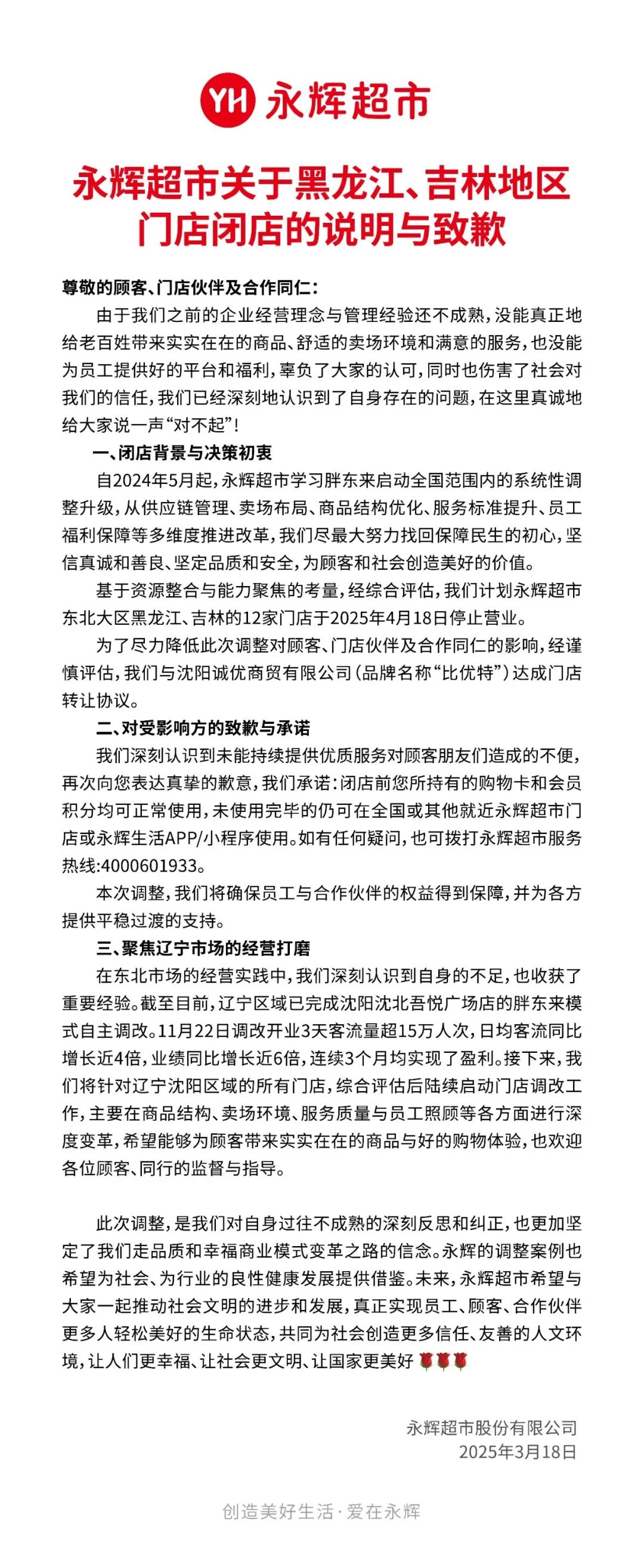 3月18日,东北永辉超市微信公众号发布《永辉超市关于黑龙江、吉林地区门店闭店的说明与致歉》一文,称永辉黑龙江、吉林共12家门店预计在今年4月18日停止经营。