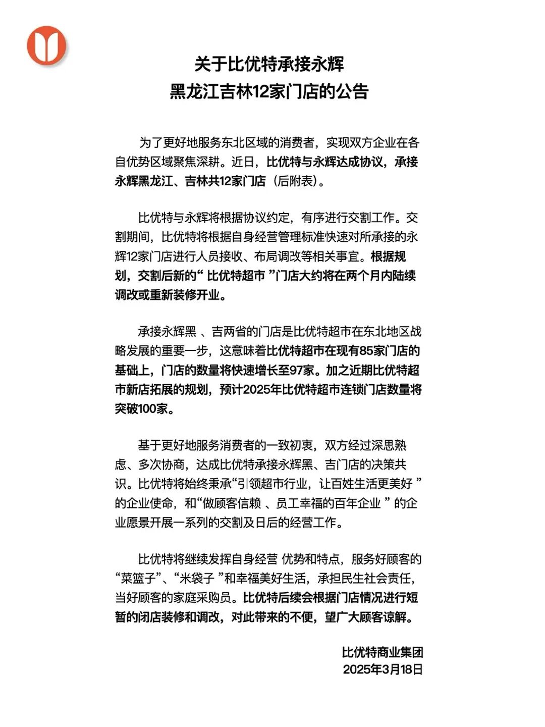 与此同时,黑龙江当地零售企业比优特也发布公告称,比优特与永辉达成协议,承接永辉黑龙江、吉林共12家门店。