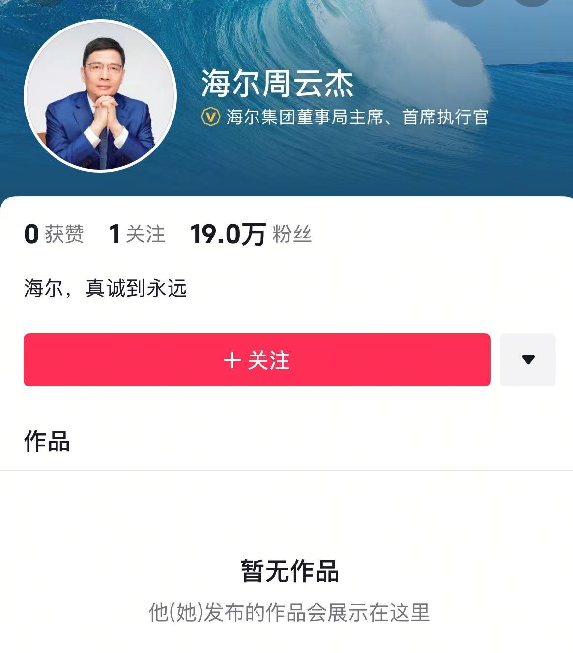 此外,海尔集团董事局主席、首席执行官周云杰已于3月18日在抖音平台开通个人账号,并带有官方认证金V。截至发稿,周云杰抖音账号暂未发布作品,粉丝量已涨至19万。