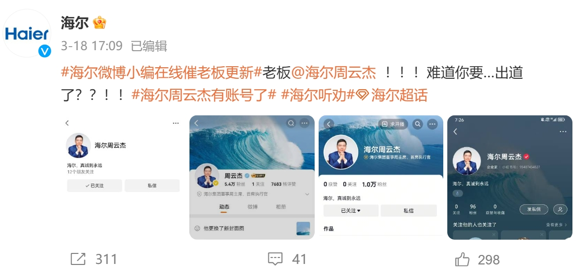 3月18日,海尔官方微博发文称:“老板@海尔周云杰 !!!难道你要…出道了??!!”