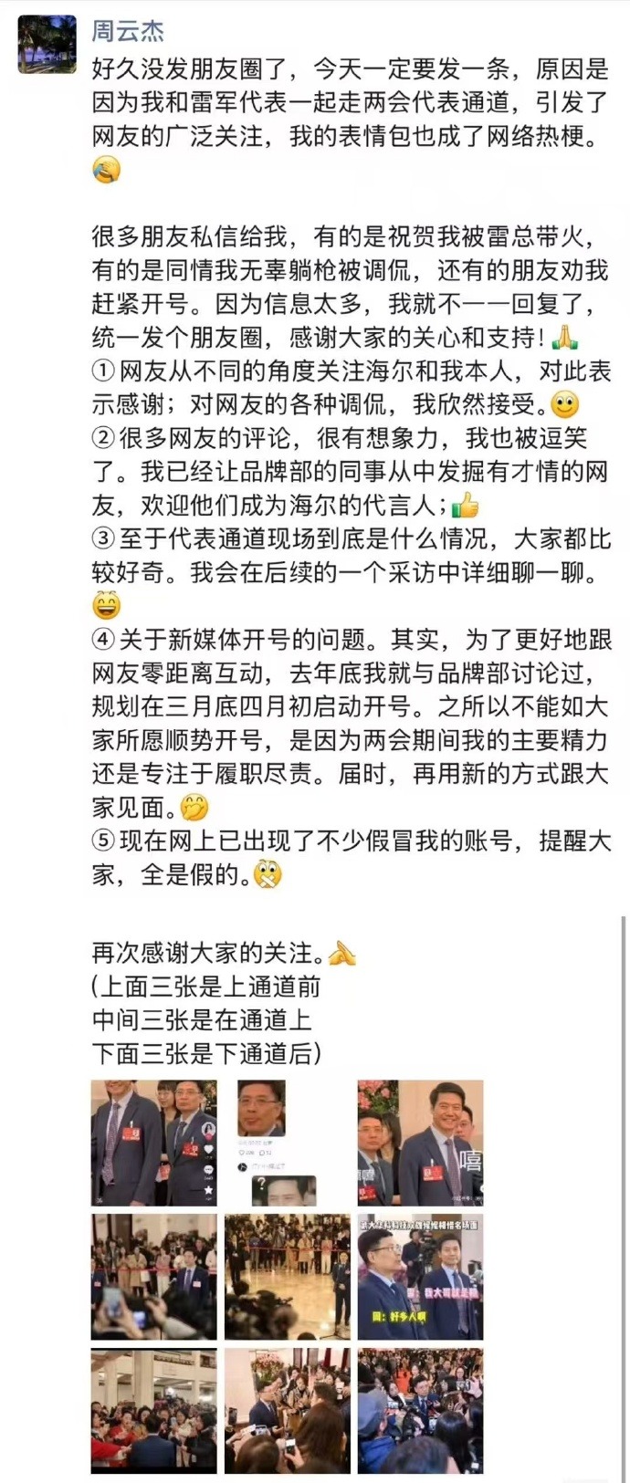 周云杰表示,“好久没发朋友圈了,今天一定要发一条,原因是因为我和雷军代表一起走两会代表通道,引发了网友的广泛关注,我的表情包也成了网络热梗。很多朋友私信给我,有的是祝贺我被雷总带火,有的是同情我无辜躺枪被调侃,还有的朋友劝我赶紧开号。因为信息太多,我就不回复了,统一发个朋友圈,感谢大家的关心和支持!