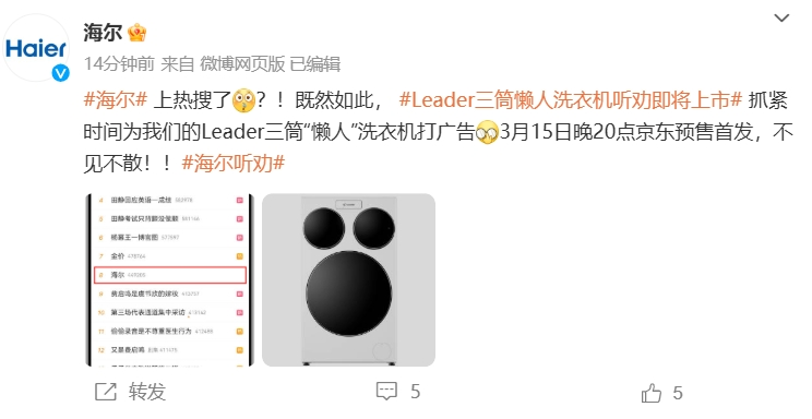 3月11日,海尔在微博宣布,Leader三筒懒人洗衣机即将上市,新品将于3月15日晚20点在京东预售首发,官方宣称“为大家解锁三筒快净0手洗‘懒人新纪元’”。