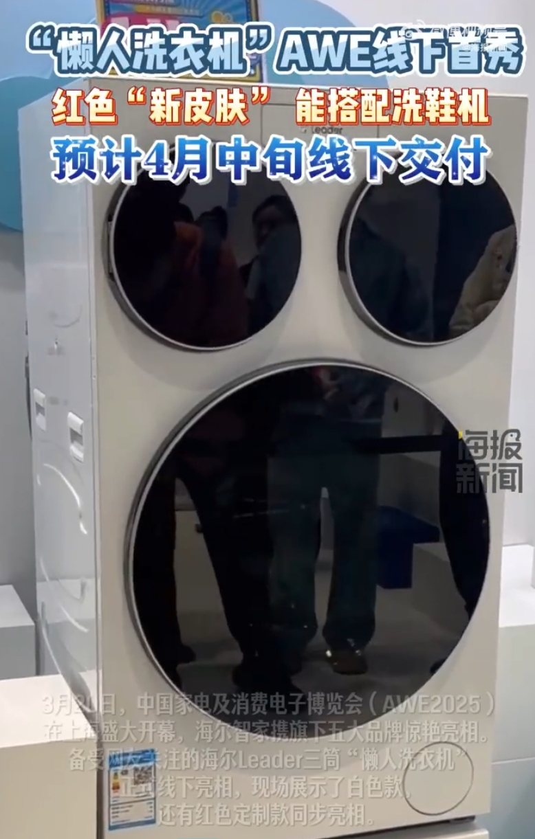 【3月20日,AWE2025在上海开幕,海尔智家携旗下五大品牌亮相,备受关注的Leader三筒“懒人洗衣机”正式线下展示,其白色款和红色定制款同步亮相。该洗衣机一周预售8.8万台,最快4月中旬交付,京东商城显示预售价4999元,国补后3999元起,最晚4月21日发货。3月11日海尔宣布其即将上市并于15日晚在京东预售首发。此外,海尔集团周云杰3月18日开通抖音账号,粉丝量已涨至19万,此前他与雷军两会代表通道同框引发网友关注,周云杰对此进行了回应。】