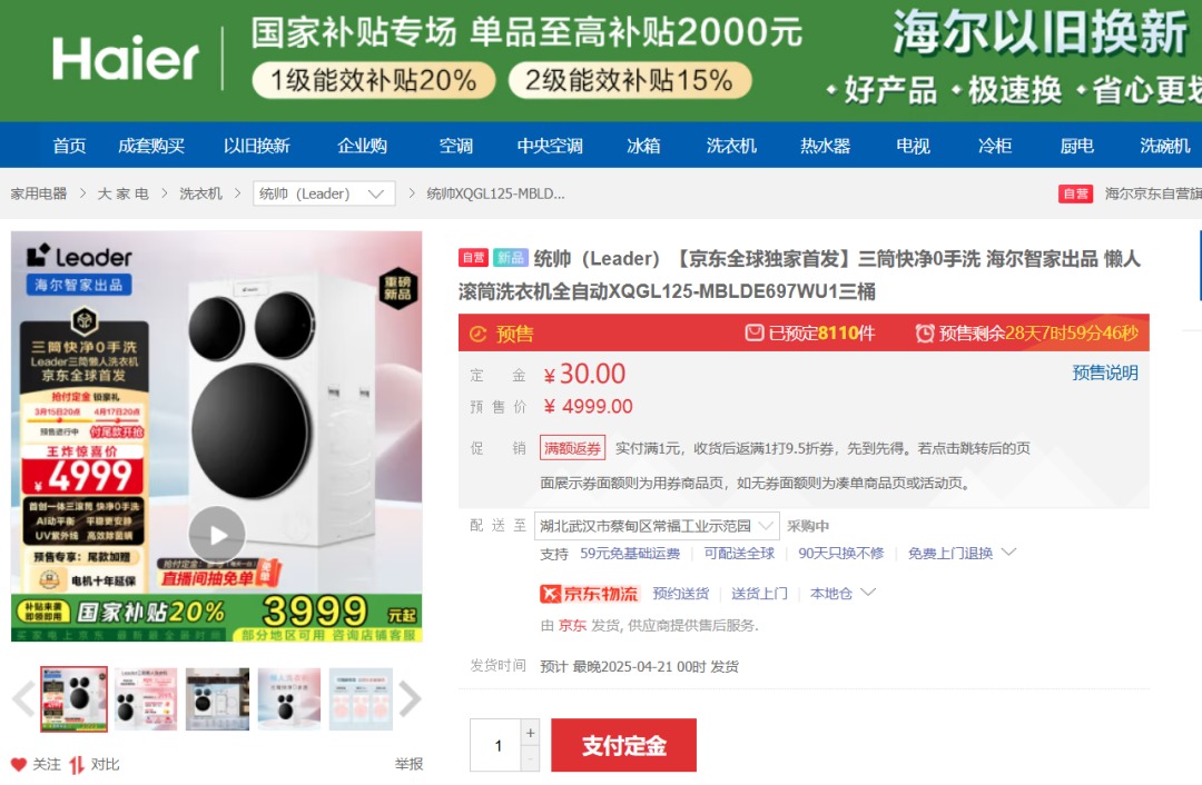 京东商城显示,海尔懒人滚筒洗衣机定金30元,预售价4999元,国补后价格3999元起。现在下单,预计最晚4月21日发货。