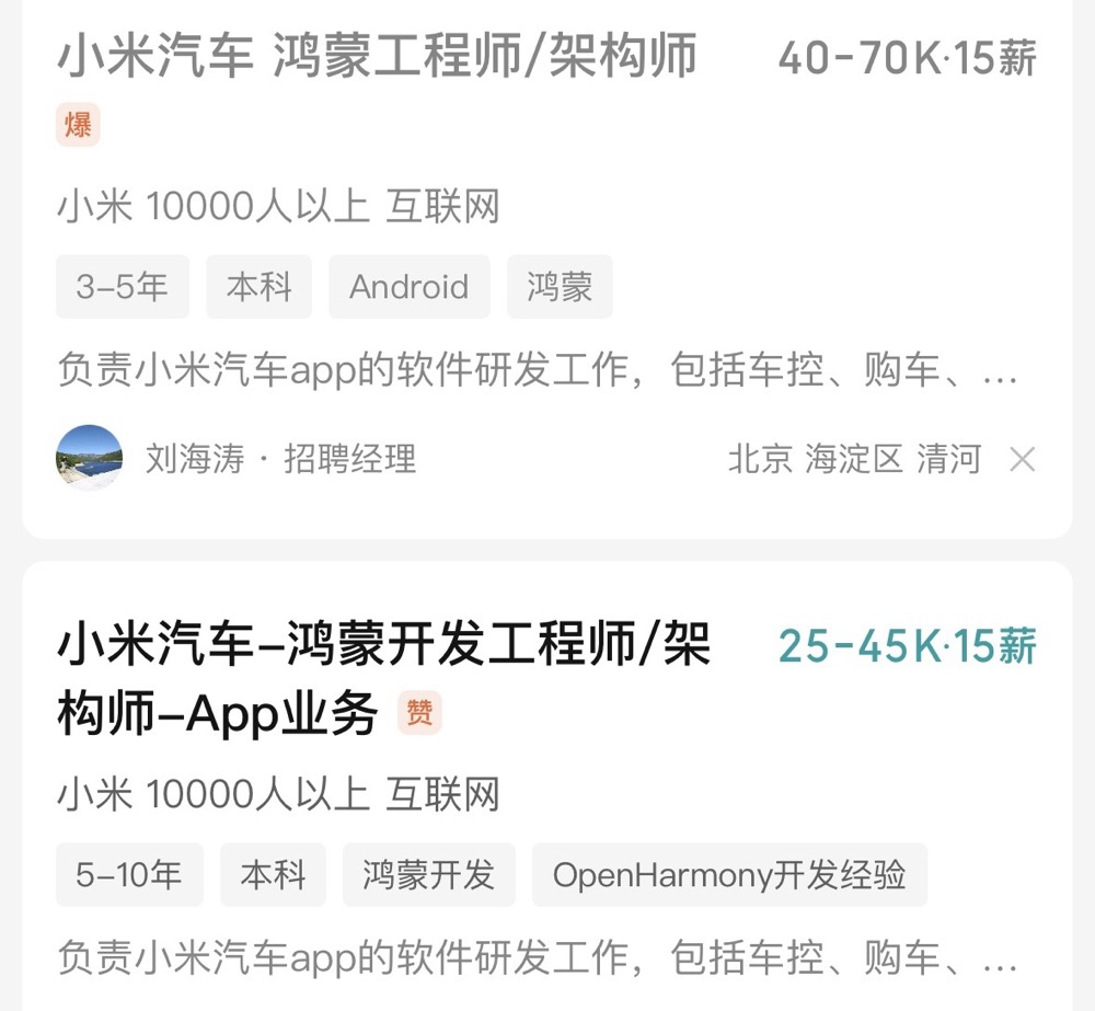近日,小米集团在第三方招聘平台更新了“鸿蒙工程师/架构师”等职位,月薪从2.5万到7万区间,提供15薪福利。职位详情显示,该职位主要负责小米汽车App的软件研发工作,包括车控、购车、社区、商城等;完成软件架构、模块设计和开发工作;改善软件的易用性、稳定性,提升性能和用户体验等内容。