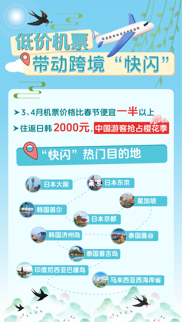 3月至4月是旅游淡季,机票与酒店价格相较于春节和“五一”假期能低一半以上。得益于低廉的机票价格,不少中国游客选择“拼假”,前往日本、韩国及东南亚地区,来一场“快闪”踏春。