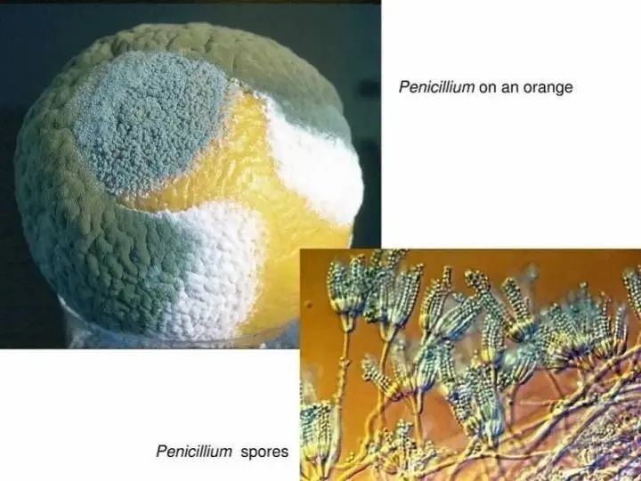 橘子皮上长的霉菌以展青霉为主。展青霉本身是无色或淡色的,但其繁殖形成的孢子是蓝绿色,就是我们肉眼可见的“绿毛”。它们的次级代谢产物展青霉素,虽然与大名鼎鼎的青霉素只有一字之差,但两者的功效却是天壤之别。青霉素是由特异青霉产生的能够抑制细菌生长的抗生素,但展青霉素却是一种有害的毒素。