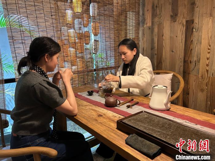 3月23日,在南昌市红谷滩区一新中式茶馆,两名年轻顾客正在饮茶。朱莹摄
