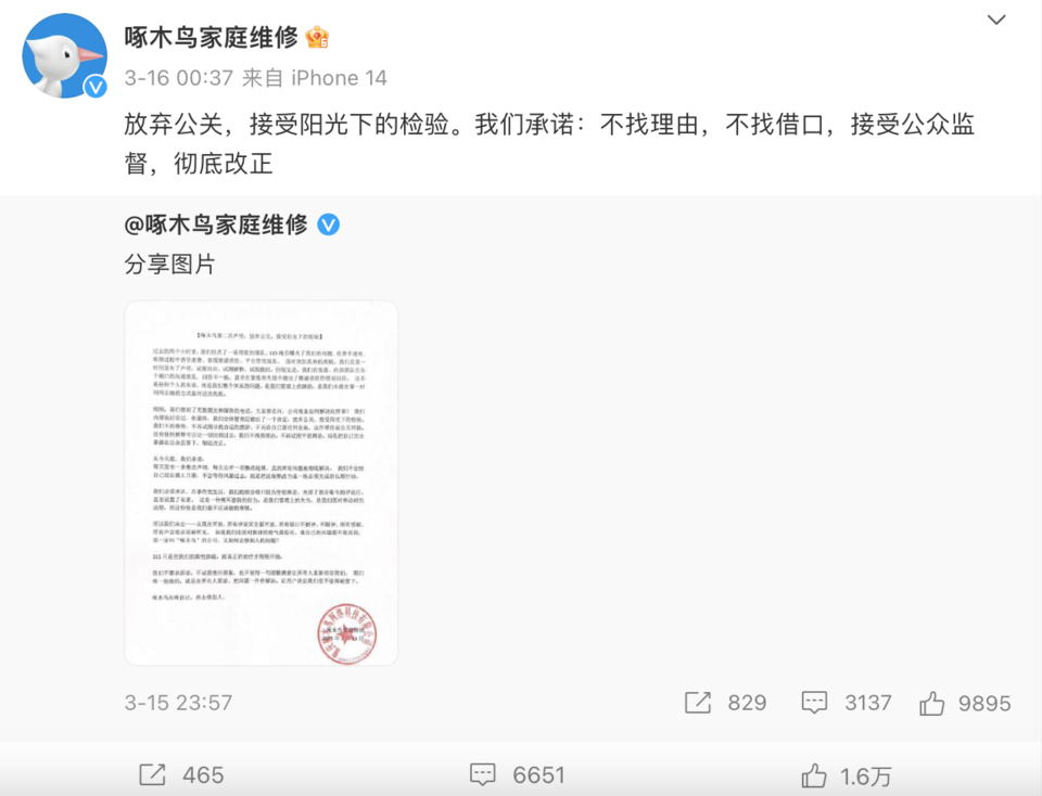 针对目前啄木鸟的投诉以及后续的整改情况,记者联系了啄木鸟维修方面。其表示,关于整改情况会发布在其官方微博上。