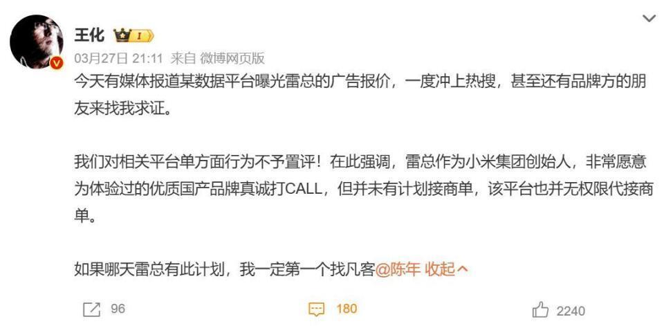 针对这一传闻,小米集团公关部总经理王化于3月27日晚间在社交媒体上发文进行辟谣。王化表示,小米集团对相关平台单方面的行为不予置评,并强调雷军作为小米集团的创始人,虽然非常愿意为体验过的优质国产品牌进行宣传,但并未有计划接拍商业广告,同时指出该平台也并无权限代接雷军的商业广告。
