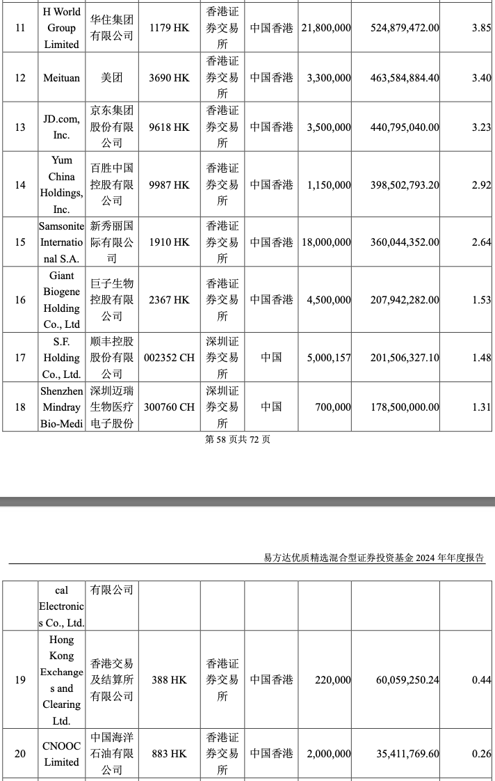易方达优质企业三年持有2024下半年前二十大重仓股
