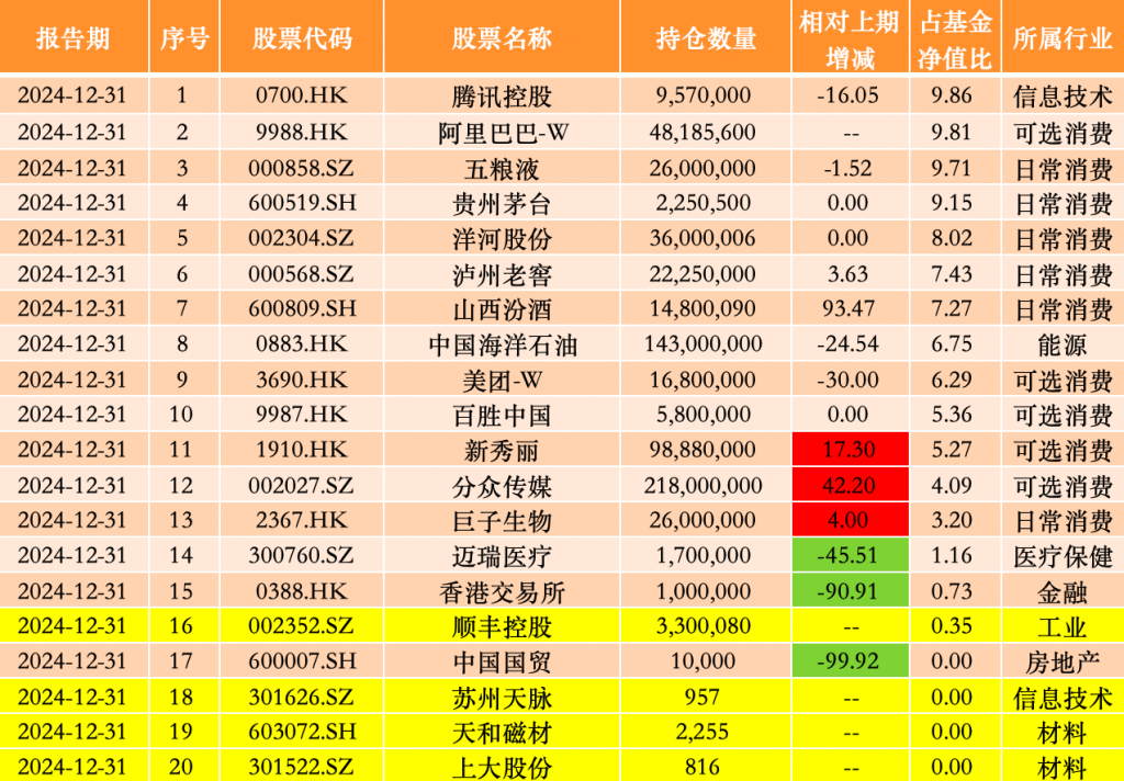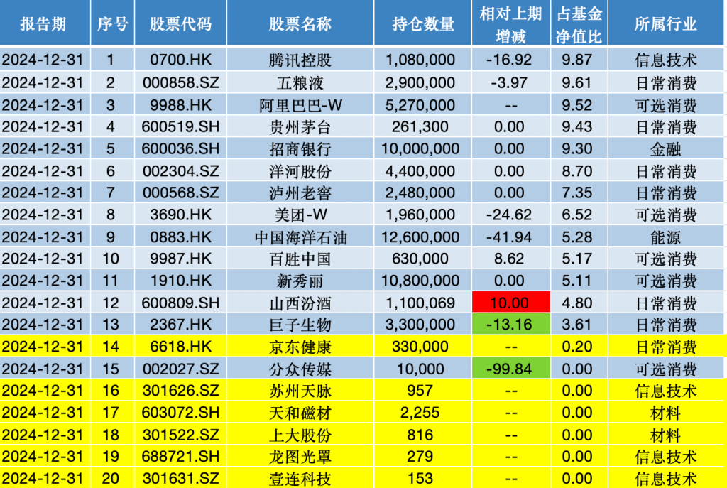 与易方达蓝筹精选较为一致,张坤同样在易方达优质精选中新入了顺丰控股;此外,京东(9618.HK)在2024年上半年被该基金卖出之后,又于2024年下半年重新买回,持股数量为350万股。