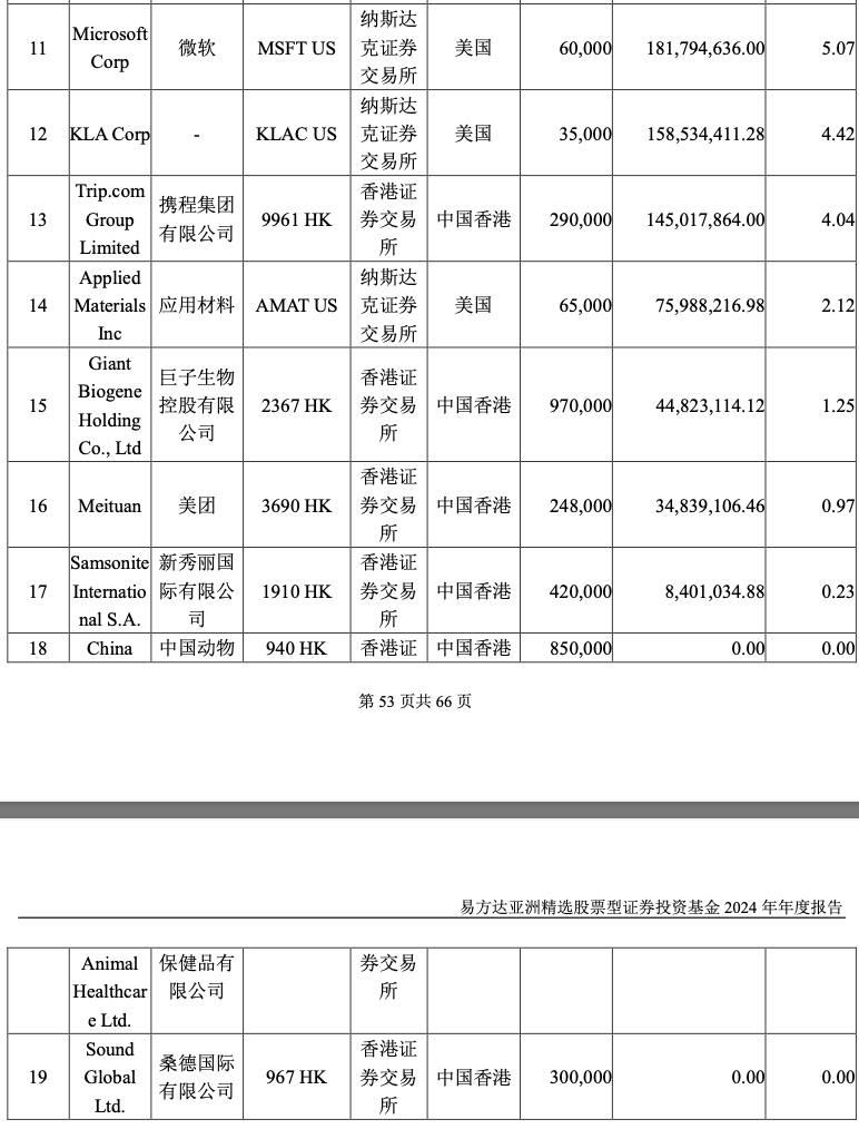 从易方达亚洲精选的隐形重仓股来看,该基金在2024年下半年继续增持应用材料(AMAT.O);减持携程(9961.HK)、巨子生物、新秀丽。