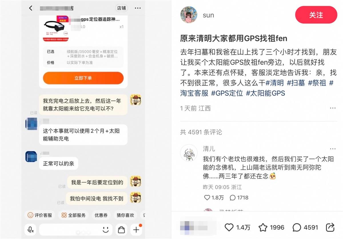 近日,一名网友在小红书分享的扫墓迷路自救指南引发热议。她自述因祖坟位置偏僻,去年和爸爸满山找了三小时才顺利找到祖坟。最终她决定听从朋友的建议,在淘宝购入太阳能GPS定位器,“一劳永逸”解决难题。