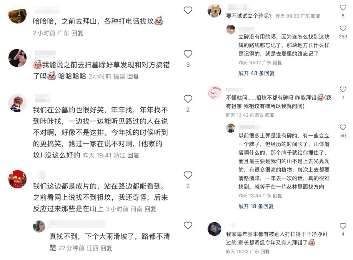 扫墓迷路这一现象并不少见,尤其是在南方地区。山地墓区地形复杂,加上草木疯长、路标易被破坏等因素,不少家族甚至需要方向感极强的领路人才能完成祭扫。在热门帖子里,有近5000网友分享了拜错坟迷了路的经历:“之前去拜山,各种打电话找坟”“每年的杂草比人都高,只记得大概方向特别难找”“之前去扫墓除好草发现和对方搞错了”“真找不到,要是下个大雨滑坡了,路都不清楚”……甚至还有人连续两年拜错祖坟,割草1小时后才惊觉乌龙。