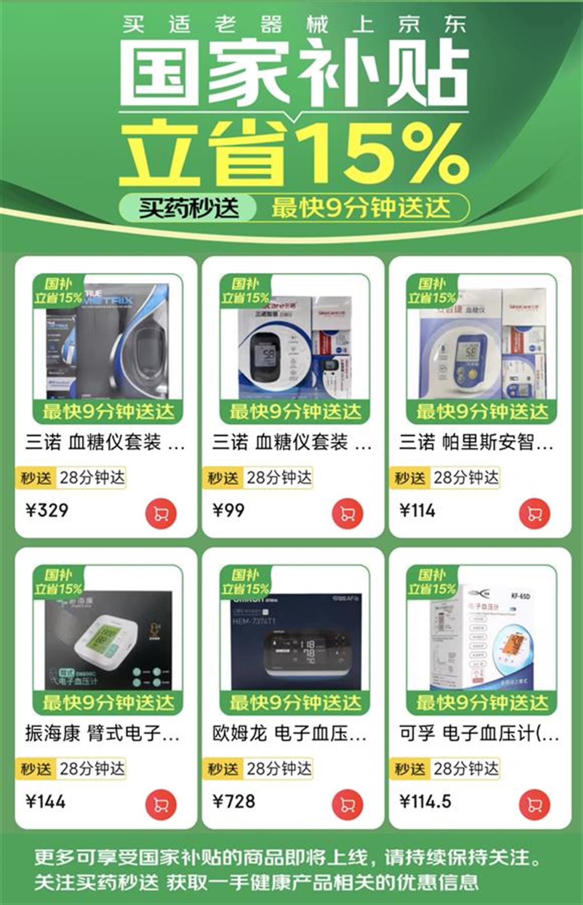 为了让用户更方便地使用该服务,京东买药秒送专门设置了“国家补贴 买药秒送”专区,覆盖的商品不仅包含血压计、血糖仪、雾化器、制氧机、呼吸机等智能健康监测类产品,后续还将扩充拐杖、助行器、手动轮椅、电动轮椅、移位器、床边扶手、洗澡椅、马桶起身助力架等居家适老化健康商品。