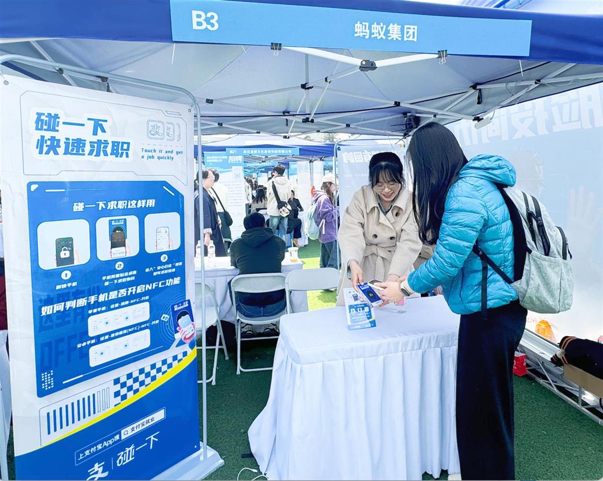 此次招聘现场,蚂蚁集团还带来另一项数智化就业服务,刷智能求职机、快速投递简历,为高校学生找工作提供一站式求职服务,也吸引了不少大学生前来体验。