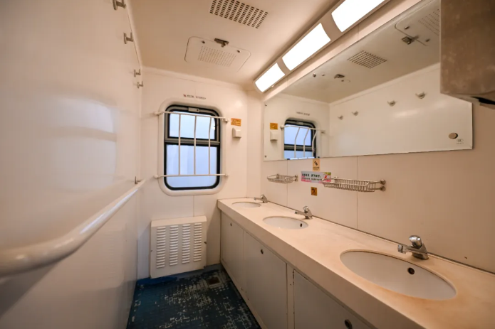记者看到,经适老化改造的列车采用4人一包房设计,没有中铺,只有上下铺,铺位在原有基础上加宽了8厘米;洗漱间内设有3个洗手池,卫生间配备坐便器、防滑地面、设有安全扶手……