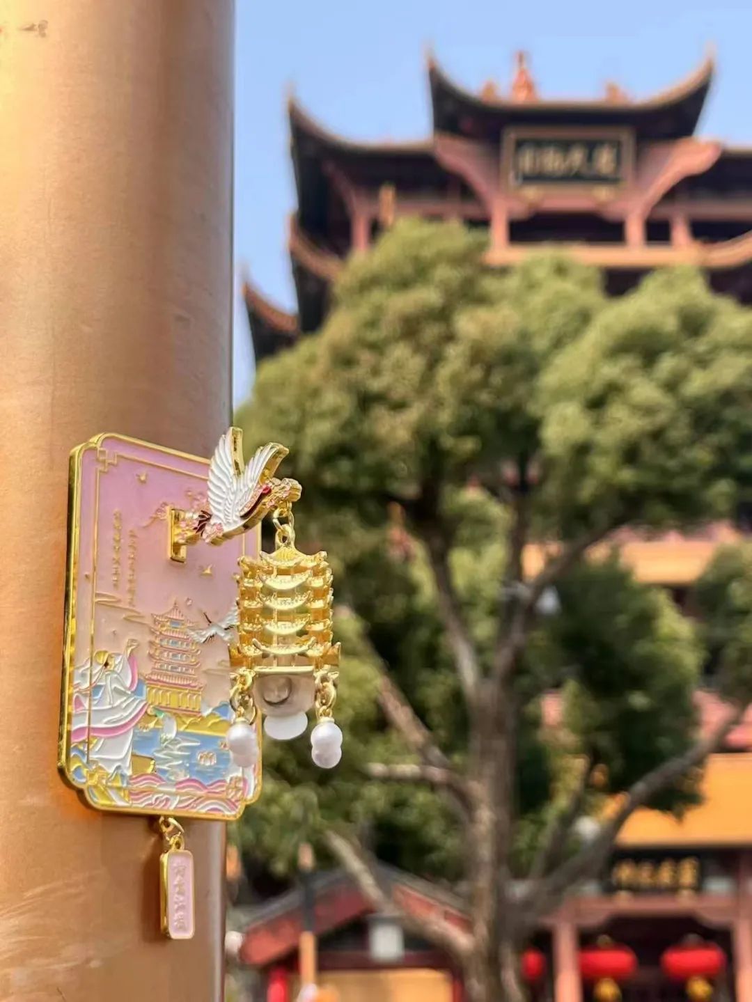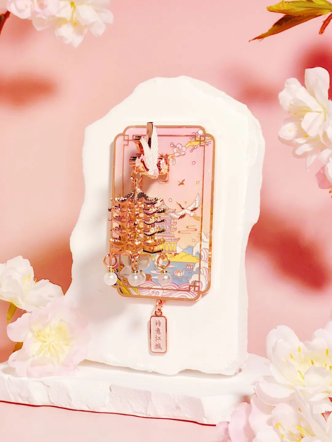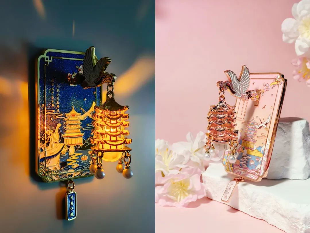 樱花季,黄鹤楼夜光冰箱贴出樱花色了。外观上,利用夜樱环绕的黄鹤楼为主视觉,巧妙运用渐变珐琅工艺,还原楼阁飞檐的鎏金质感,精致又梦幻。