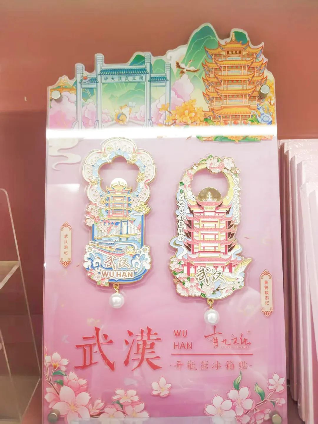 两款冰箱贴,一个主色调为蓝色,一个主色调为粉色,在湖北省博物馆、黄鹤楼、昙华林等文创店,十分受欢迎。