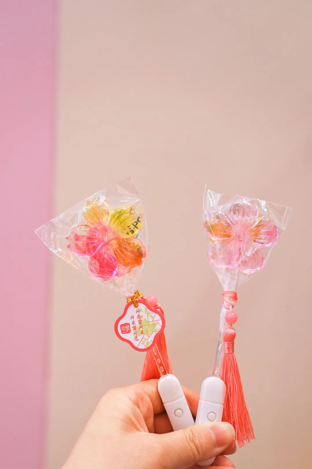 杨博智介绍,3月份共上新了300多款樱花主题文创品。其中,樱花饼、樱花糕、樱花梳妆镜、樱花流沙���冰箱贴等产品备受欢迎。一只15元的樱花夜光棒棒糖单品销售额一年能达到300万元,其中超过70%的销量集中在樱花季期间,今年推出了不同的粉色系棒棒糖。