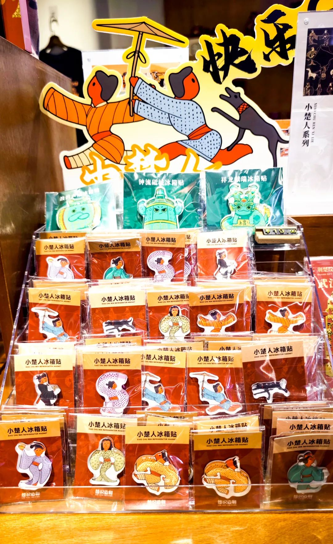 15个快乐奔跑的小楚人冰箱贴,一面黄鹤楼樱花金属翻页随身镜,一个六面印着武汉地标和樱花合影的魔方……在昙华林楚汉造物店里,来自上海的游客李敏展示购物战果。