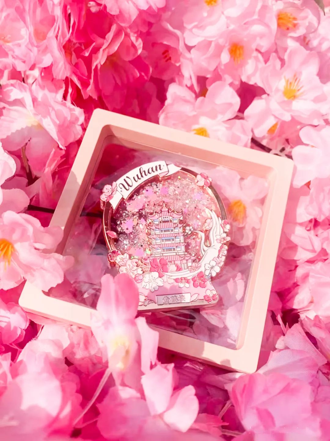 小编看到这款冰箱贴,主色调为粉色,透明水晶球的造型,将樱花簇簇拥拥的黄鹤楼、仙鹤等元素融入其中,晃动水晶球,可以看到亮晶晶的流沙在晃动,十分治愈。