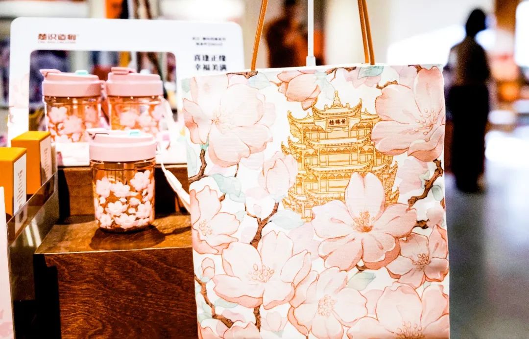 小编在楚汉造物看到,专为武汉樱花季设计的“樱你而美”文创系列被摆在了进门最醒目的地方。团团樱花簇拥着黄鹤楼的图样,印在粉色系的水杯、笔记本、随身镜等上,显得十分精致。