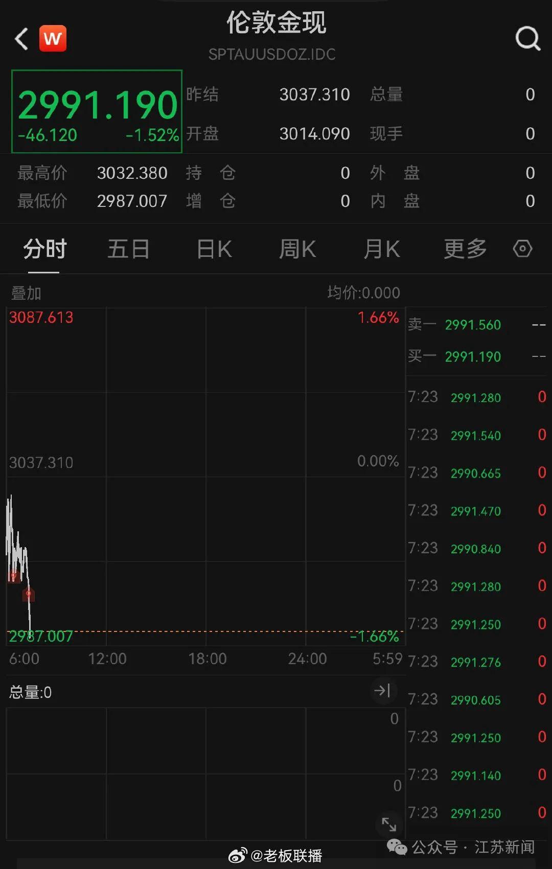 4月7日早间,现货黄金自3月21日以来首次跌破3000美元/盎司,日内跌1.28%。