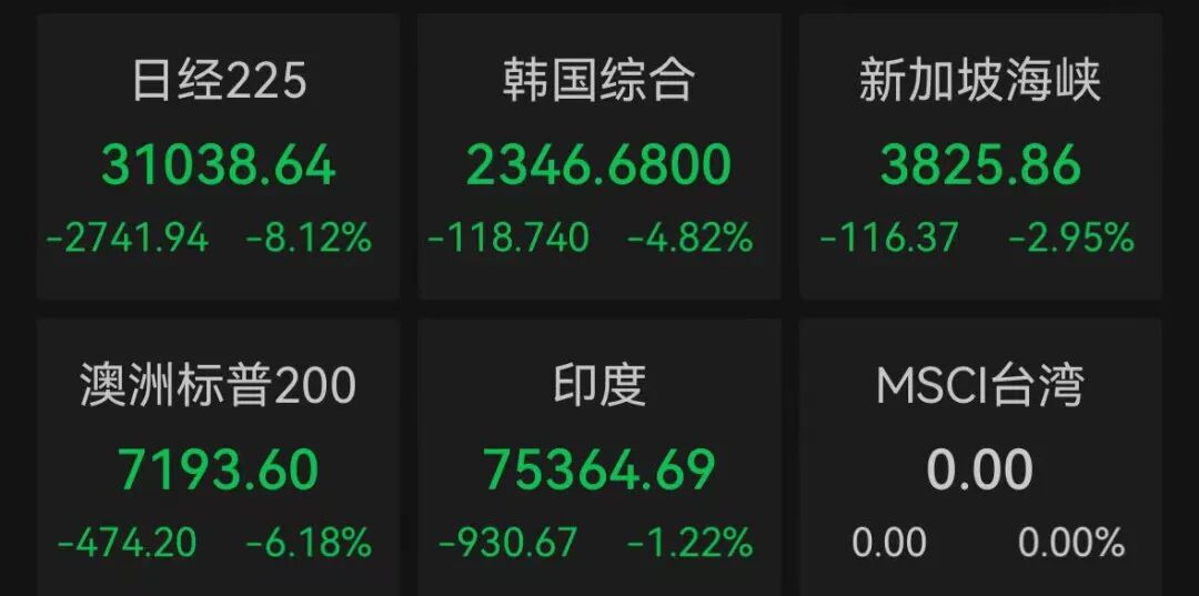 欧洲股指期货同样大幅下挫,欧洲STOXX50指数期货跌超4%,DAX指数期货跌近5%,富时指数期货跌超4%。亚太市场方面,日经225指数期货、东证指数期货在触及跌停板后暂停交易。日经225指数盘中跌超8%,韩国综合指数盘中跌超4%,澳洲标普200指数盘中跌超6%。韩国交易所在KOSPI 200指数期货下跌5%后,启动了KOSPI的sidecar停牌机制,并暂停程序化交易5分钟。