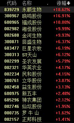 4月7日早盘,养殖业板块短线拉升,湘佳股份(002982)涨停,金河生物(002688)、福成股份(600965)此前封板,晓鸣股份(300967)、永顺生物涨超15%,立华股份(300761)、神农集团(605296)、益生股份(002458)、圣农发展(002299)、民和股份(002234)等跟涨。