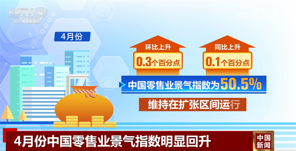 4月份,中国零售业景气指数为50.5%,环比上升0.3个百分点,同比上升0.1个百分点,维持在扩张区间运行。