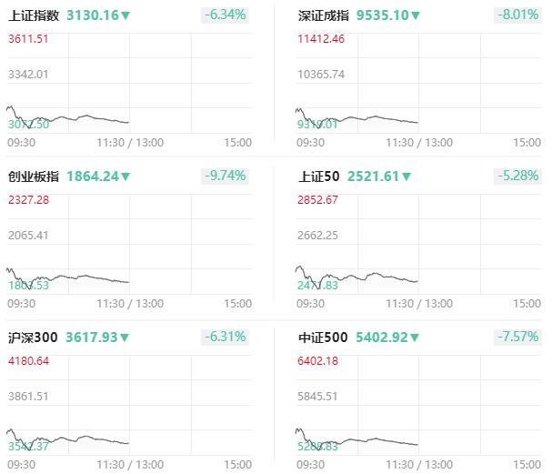4月7日,A股遭遇“黑色星期一”,开盘后大幅下挫。截至午间收盘,上证指数下跌6.34%,深证成指下跌8.01%,创业板指下跌9.74%。市场上午成交额放大,为10713亿元,较上周四上午增加3379亿元。